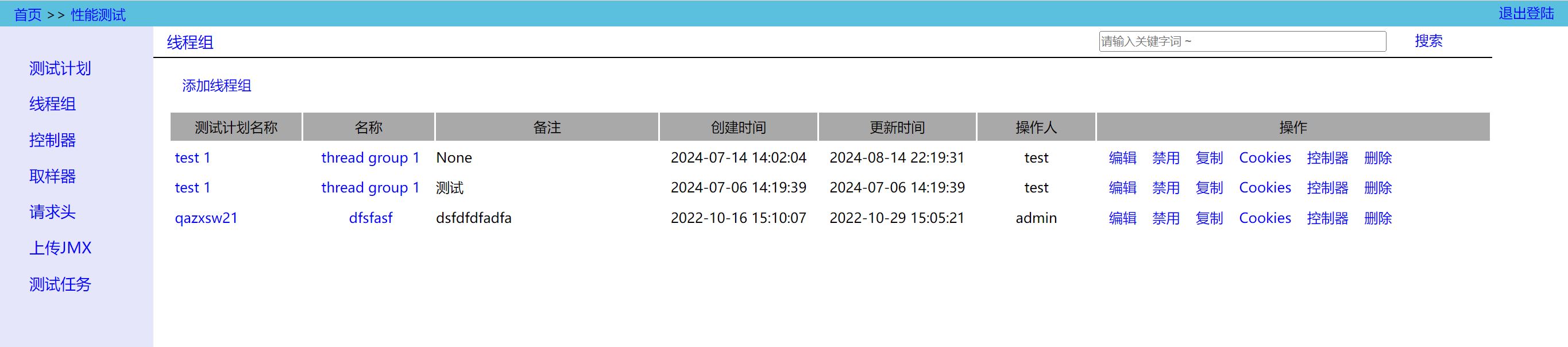 在左侧点击 Thread Group,可以查看所有的线程组;如果在 Test Plan 中点击 ThreadGroup,可以查看该测试计划下的所有线程组。线程组列表如下: