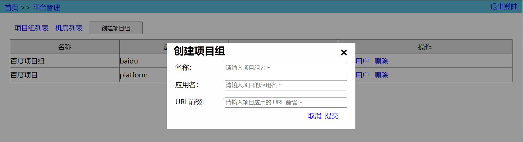 在项目组列表中,可以查看所有用户所在的项目组的配置,可以往项目组中添加/删除用户。点击 Create Group 按钮(仅管理员可见),可以创建项目组,需要设置项目组应用的唯一标识符和后端接口的 prefix。