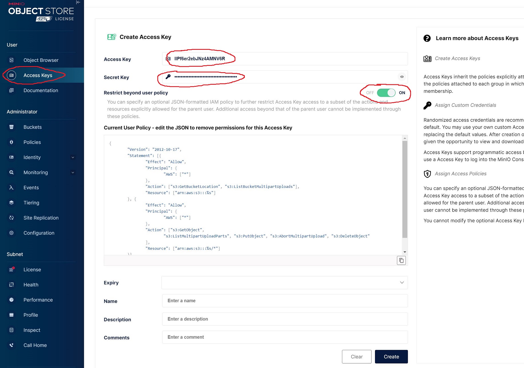 打开 User Policy,配置数据访问策略,如下。然后把 Access Key 和 Secret Key 配置在 config.conf 中。