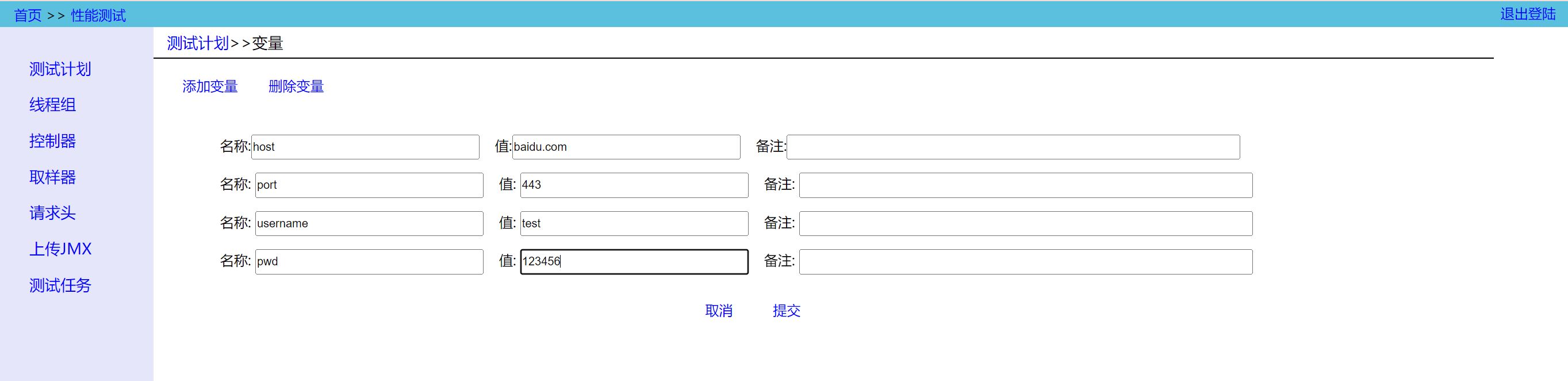 - Variables:设置全局变量,对应 JMeter 中的测试计划中的 “用户自定义的变量”;
