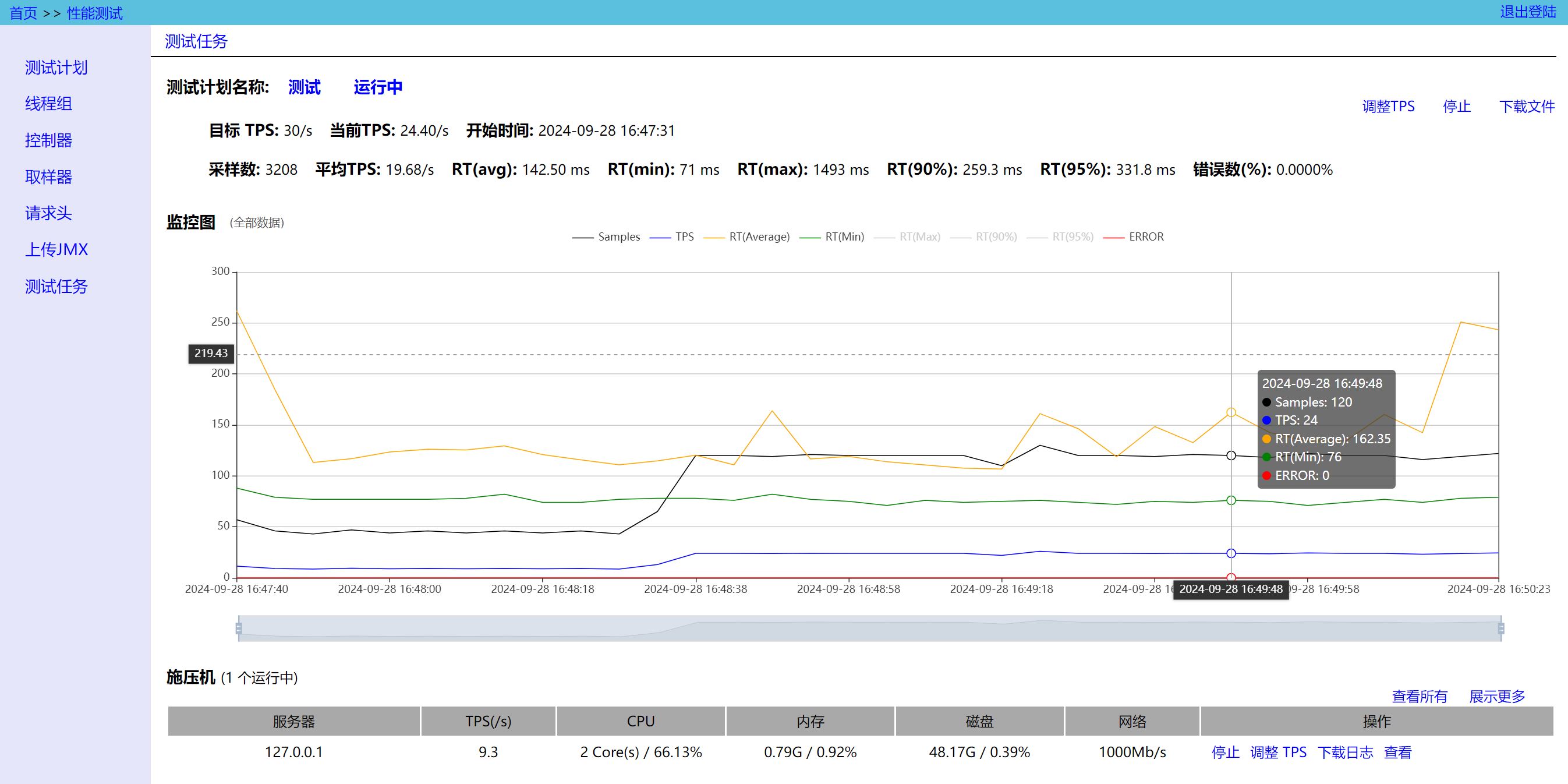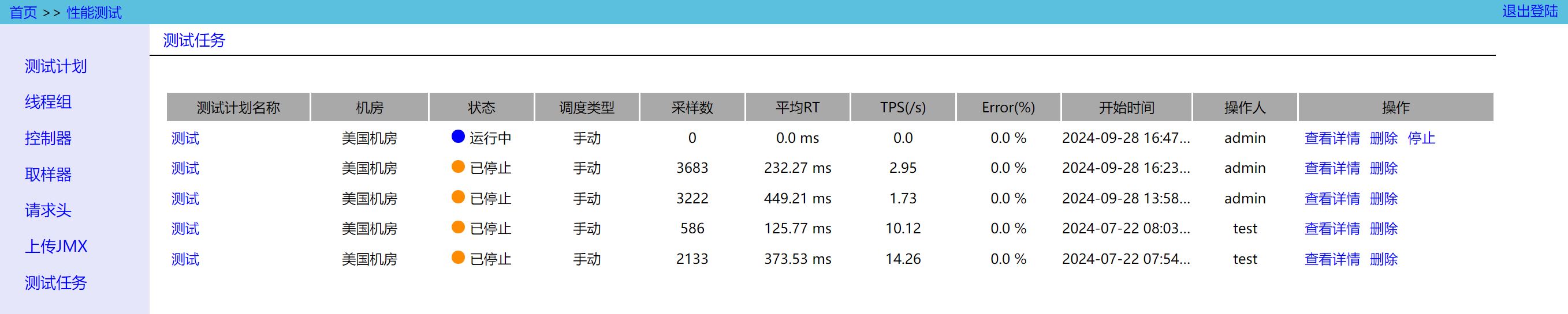 在左侧点击 Test Task 可以查看所有的测试任务,所有待执行、执行中、已停止的测试记录都会显示在这里,只有测试完成后,才会显示 Sample、TPS、RT、Error 等数据。
